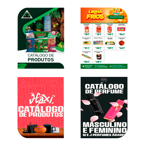 Páginas que vendem sem empurrar. Projetamos catálogos que organizam produtos, contam histórias e guiam o olhar do cliente até a compra. Layouts limpos, hierarquia visual clara e imagens que valorizam cada item.